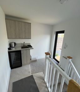 The very latest in smart lighting, which links to the Apple Home Pod music system, highlights the decking Adjacent to the roof terrace is the upper landing with a kitchenette with a wine/drinks fridge, kettle, sink and ample cutlery, crockery and glasses to save you going downstairs for a cuppa or another chilled beer. There is also a office desk and chair for if you do need to WFH whilst you visit.